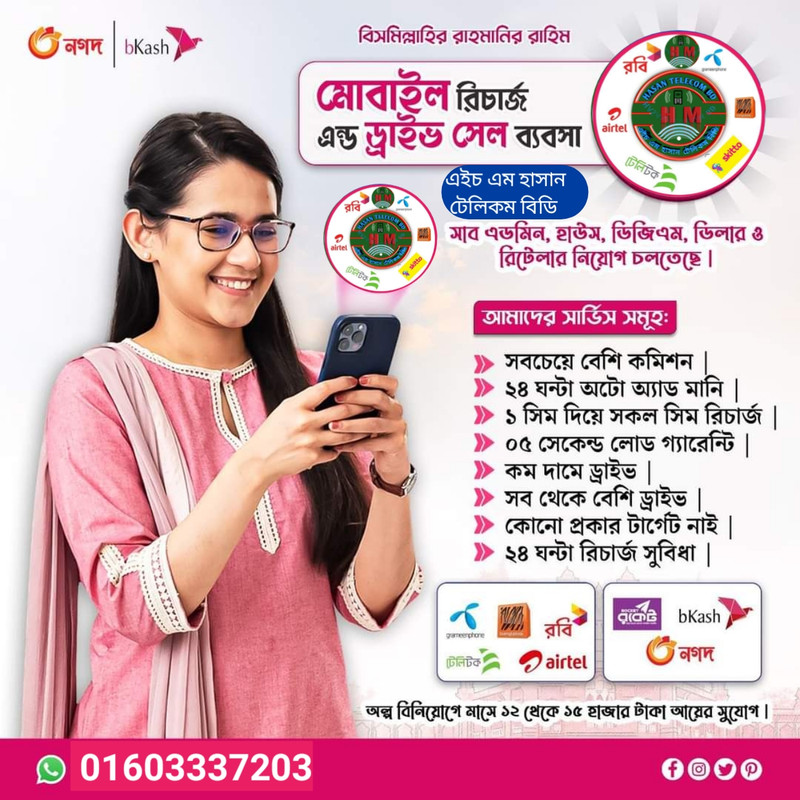 Products details of আহ! লাভ আর লাভ! মোবাইল রিচার্জ ব্যবসা করুন আর পান পতি হাজারে কমিশন! কম দামে এমবি মিনিট তো থাকছি সেরা কমিশন, সেরা সুযোগ! এইচ এম হাসান টেলিকম বিডি— সেরা কমিশনে সবার আগে যোগাযোগ 01603337203